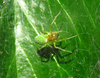 I moved part of the web aside to have a closer look (also top shot). This is a female, with her whole body green. Once I had seen one, I found another, and another, almost every ivy leaf had it's little Nigma in it.
