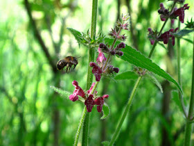 One of such bees, Anthophora furcata, the Fork-Tailed Flower Bee is a summer bee, active in June and July in the British Isles. These are long-tongued, relatively specialised species, which collects pollen mostly of Lamiaceae (and to a minor extent of Scrophulariaceae) flowers. They are often present in gardens where they feeds on Lavender, Tree Germander and Lamb's ears (Stachys byzantina) as well as foxgloves. A couple of males I spotted yesterday, the first of the year, were feeding on a patch of Stachys sylvatica, and the photo of one of them on top of the post shows the position of the top lip of the flower - which hides the stamens and pistil - touching the bee's head.